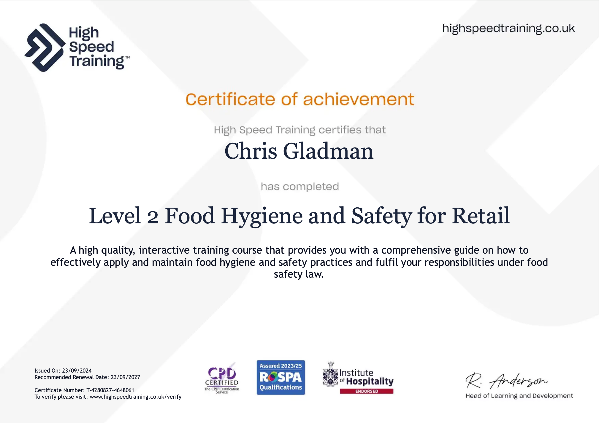 We believe that our dedication to maintaining high hygiene standards is crucial not only for compliance but also for building trust with our customers. As we continue to grow, we remain committed to upholding these standards and pursuing further accreditations to enhance our service and product quality.